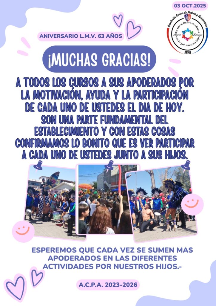 Buenas tardes, queremos agradecer sinceramente a todos ustedes también a sus apoderados por su valioso apoyo y colaboración en las actividades de la comunidad escolar por motivo de su aniversario 63 que se llevaron a cabo durante esta semana.