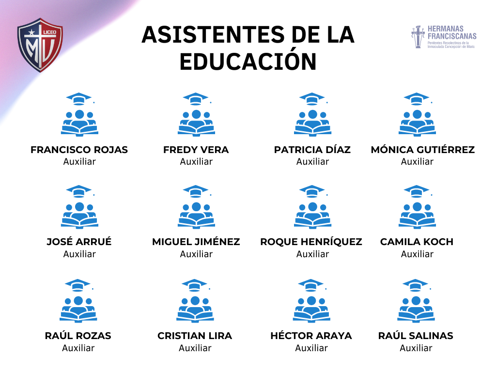 Aseo y Mantención Francisco Rojas Auxiliar Fredy Vera Auxiliar Patricia Díaz Auxiliar José Arrué Auxiliar Miguel Jiménez Auxiliar Roque Henríquez Auxiliar Mónica Gutiérrez Auxiliar Raúl Rozas Auxiliar Camila Koch Auxiliar Cristian Lira Encargado de Mantención Héctor Araya Nochero Raúl Salinas Nochero