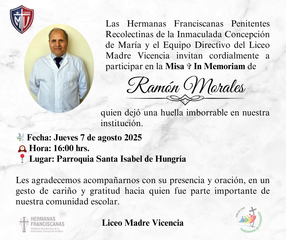 Estimada comunidad educativa: Con profundo pesar, informamos el sensible fallecimiento de don Ramón Morales Figueroa Q.E.P.D. El tío Ramón era inspector de nuestro Liceo desde el año 2001, y muy querido miembro de nuestra comunidad. Ramón fue un funcionario profundamente comprometido con su labor, cercano a los estudiantes, respetuoso y siempre dispuesto a colaborar. Su calidez humana, su vocación de servicio, y su profunda fe en Dios lo convirtieron en una figura muy significativa para todos quienes lo conocimos. Agradecemos su comprensión y apoyo en este difícil momento, y pedimos mantener en sus pensamientos y oraciones a la familia de Ramón, a quienes acompañamos con cariño y solidaridad.